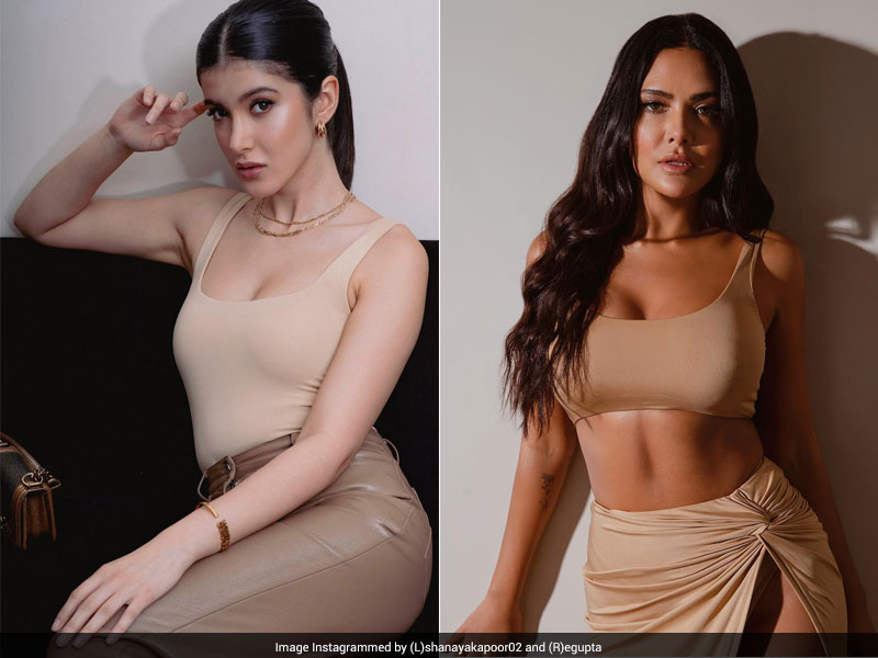 Shanaya Kapoor is going to make her Bollywood debut very soon and has got us hooked to her trendy wardrobe. She chose a body-hugging t-shirt in a pastel shade and paired nude wide leg pants with it. The outfit looked uber chic and trendy. She wore a golden choker and golden studs as the only accessories with her outfit while tying her hair in a sleek ponytail.