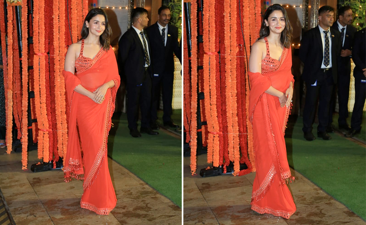 Alia Bhatt's sarees have had a good run this year. After bringing the quintessential Bollywood classic - the flowy chiffon saree, back in vogue, it seems like saree fever is far from over for the star. At the grand Ganesh Chaturthi celebration at the Ambani residence, Antilia, Alia Bhatt made a monochrome entry in a red Arpita Mehta saree. A splendid red saree was the choice of the evening for the celebrity. She paired a plain red saree with tasselled borders with an embellished blouse in the designer's signature style. While one may have assumed that to be the only red touch to her outfit, Alia tops her look with her brand-new haircut and a coral lip, a change from her usual pick of neutral lip.