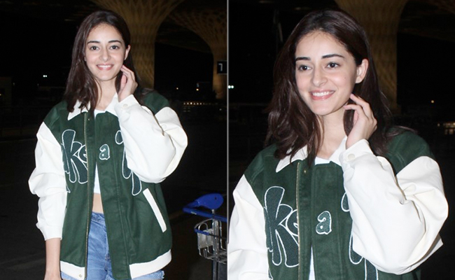 The airport is where Bollywood delivers its casual fashion best. There's always a chance celebrities show up looking excessively styled and preened to travel in but there are still some who get the memo to dress casually, comfortably and still stylishly. It definitely hit Ananya Panday's inbox because her latest travel airport says just that. The Bollywood actress was seen wearing a white crop top with a green and white printed oversized varsity jacket thrown over it. She sported a pair of light blue denim short shorts and completed it with chunky sneakers in shades of teal and burgundy. Tiny details like her blue manicure and beaded phone chain added a cute touch to her outfit. This one gets two thumbs up from us for an outfit that's comfortable and chic enough to travel in without looking like Ananya Panday is trying too hard.