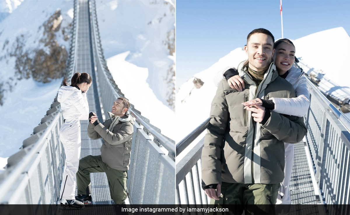 Love is in the air in Gstaad thanks to Hollywood star Ed Westwick, who went down on one knee to pop the big question to his girlfriend, actress Amy Jackson. Well, when you are surrounded by the majestic snow-capped mountains of Switzerland and the “love of your life” is down on one knee, “Hell yes” seems like the only response. So congratulations are in order for Ed and Amy, who are now engaged, after dating for more than two years. Well, the couple certainly have a postcard moment in Switzerland to cherish forever! Courtesy: Glacier 3000, which is home to Peak Walk By Tissot—the proposal site. As it turns out, the Gossip Girl star planned his proposal very precisely, as we can see the crowd waiting on one end of the suspension bridge to make way for a picture-perfect moment. Surprised yet surreal, Amy Jackson and Ed Westwick look aww-dorable in this new phase of life.