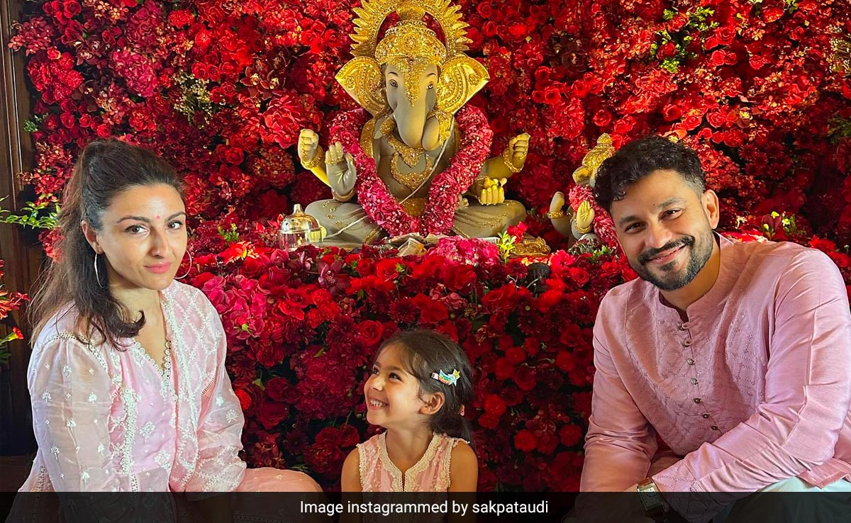 Recently for Ganesh Chaturthi celebrations, Soha Ali Khan wore a blush pink kurta set with white chikankari lace work. It was the perfect ethnic look for the festive season. She twinned with Inaaya who wore a similar sleeveless kurta in the same colour palette.