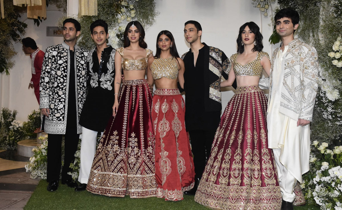 The Gen Z clan of Bollywood has been taking over the fashion sphere with their undeniably striking sartorial choices. Manish Malhotra's Diwali party saw The Archies gang putting their best ethnic fashion choices forward. The cast of Netflix's The Archies lit up the fashion scene at the Diwali party in fabulously coordinated styles. Suhana Khan, Agastya Nanda, Khushi Kapoor, Vedang Raina, Dot, Mihir Ahuja and Yuvraj Menda gave Diwali style a new spin with their traditional style. Suhana, Khushi and Dot twinned in a beautiful combination of gold and reds that gave us ultimate festive vibes. Suhana wore a red embroidered lehenga with a golden halterneck blouse while Khushi and Dot paired stunning plunging golden blouses with maroon lehengas, Khushi's being a rich velvet one. They all got the festive glam up with their makeup looks that were a perfect balance of shine and subtle.