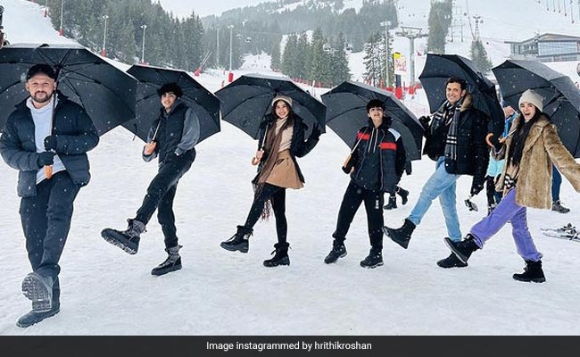 Eshan Roshan was casually dressed in cargo pants, a basic t-shirt and deep blue puffer jacket while Hrithik's sons kept the style meter running in sporty casuals and boots. We haven't missed their posing with umbrellas while it was snowing.