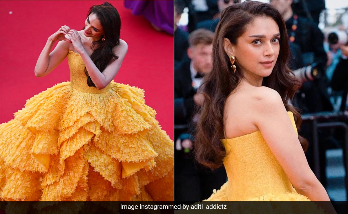 The Cannes 2023 red carpet has turned into a runway for celebrities and global stars. As we draw closer to its fashionable end, Aditi Rao Hydari doesn't seem to be done with her sartorial lineup of fabulous silhouettes. The actress walked the carpet looking like an absolute ray of sunshine. The actress came to set trends and she certainly did that right in a beautiful flared yellow gown. The voluminous sunshine yellow gown is customised by fashion designer Michael Cinco in the designer's signature style. Her dramatic floor-length gown brought a fresh wave to the red carpet and she looked like a modern-day version of Disney's princess Belle. The strapless neckline followed a fitted bodice which gave a striking structure to the overall look. The dramatic fall from the waist looked surreal as it was divided in layers that added an edge to the overall look. The very delicate self-floral appliques on the gown very subtly amped up the style quotient. She truly schooled us on how to make a striking red carpet appearance. Her gold accented earrings and of course, her personality were the only accessories she needed to slay.