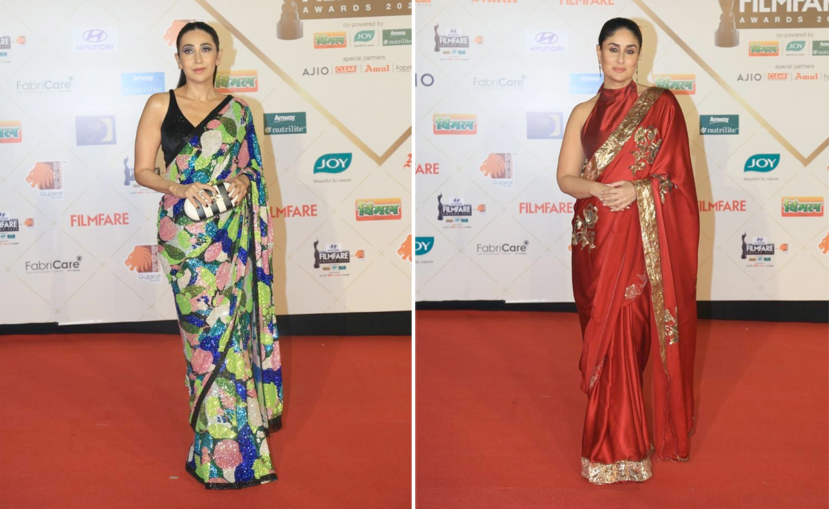 Kareena and Karisma Kapoor make a refreshing entry to the Filmfare Awards red carpet held in Ahmedabad recently. They may be sisters first, but they're fashionistas at a close second. We always knew they both think alike but it is always good to see them prove us right when it comes to their fashion sensibilities too. Far from the scintillating red carpet gowns, both the Kapoor sisters arrived in gorgeous sarees. As if we didn't know the potential of a saree on the red carpet already, this duo reinforced this very belief in sarees with differing moods.