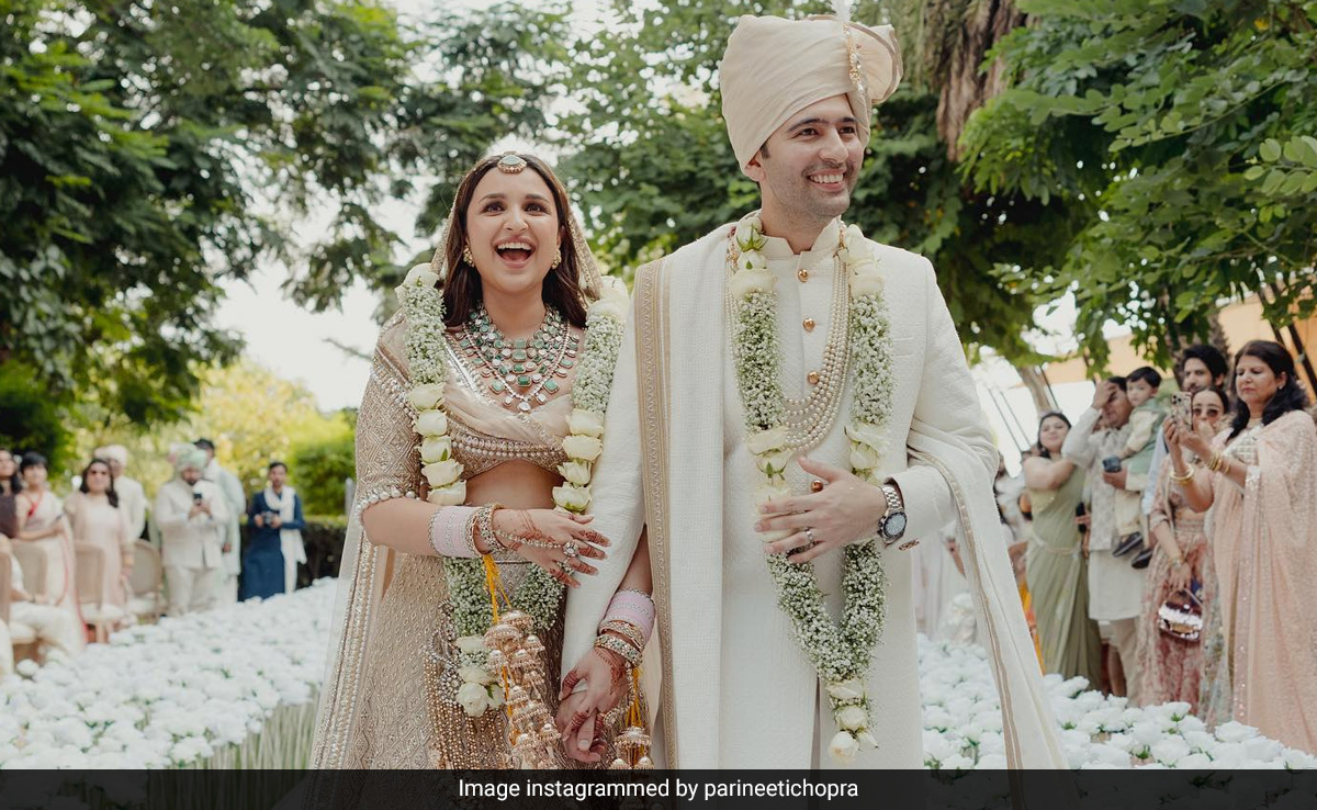 2023 seems to be a year of celebrity weddings and Parineeti Chopra and Raghav Chadha's wedding is the latest one to add to the dreamy files of celebrity nuptials. The couple tied the knot in Udaipur in an intimate Indian wedding. Their dreamy and ethereal wedding pictures are truly wholesome. With utmost love, the couple complemented each other in surreal ivory and champagne gold outfits. While Parineeti looked breathtaking, Raghav too took a minimal route. Doused with elegance in a Pawan Sachdeva creation, Raghav's personal style was reflected strongly in his wedding look. He gave a nod to pristine whites for his special day in a stunning sherwani that featured a clean gold tone detailing which perfectly matched Parineeti's look. A closer look revealed his choice for multi-layered long statement pearl strings that paired stylishly with the look along with an intricately embroidered stole. His Ecru-toned safa (turban) proudly bore an uncut diamond kalgi (turban accessory). A timeless classic touch was reflected in his look with a statement watch and tan-coloured shoes.