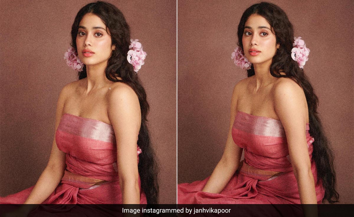 Janhvi Kapoor in sarees is the epitome of grace and elegance. On more than one occasion, the actress has proved that she carries traditional Indian sarees effortlessly. Her latest photoshoot is no exception. Janhvi looked no less than a mythological princess when she draped herself in a blush pink linen saree from the clothing label Anavila. The Gulaal Zari Border Linen Sari is made of handwoven linen and costs Rs 24,500, as per the official website. She had draped the saree in a tube-like manner and pleated it around the waist. The saree featured delicate zari borders at the bustline and lower pleats. She left her tresses loose in natural curls and adorned her hair with pink flowers. Janhvi's no-accessory look was completed with rosy makeup including blush, a dewy glow, pink eyelids, and a pink lip colour.