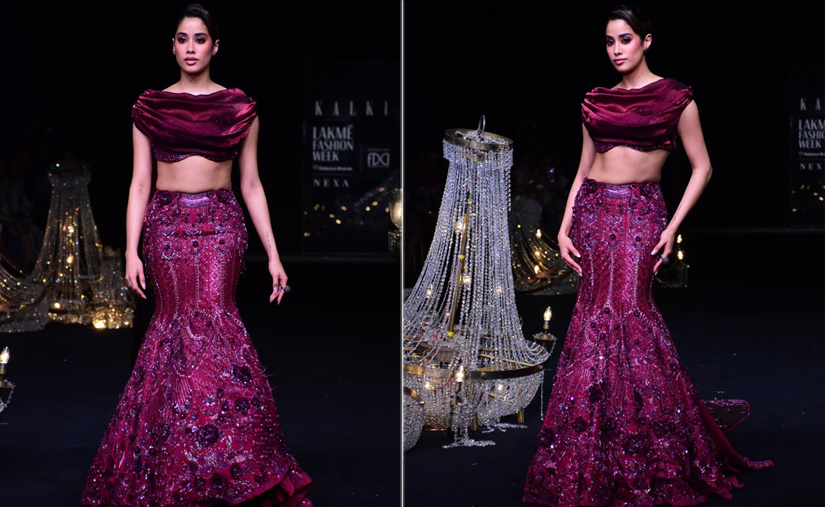 Fashion and Janhvi Kapoor can never be far apart. That's the case when the Bollywood fashionista makes it to the gym in athleisure sets, as well as when she is strutting down the red carpet. It was just as true when she walked the ramp at Lakme Fashion Week. At the event, in collaboration with FDCI, Janhvi turned showstopper for Kalki. As per usual, she got heads turning and cameras clicking. When the lights went low and music hit a melodious note, there was Miss Kapoor, making a splash on the catwalk. Janhvi looked fabulous in a deep wine lehenga as the celebrity showstopper on the ramp for the Kalki showcase at Lakme Fashion Week x FDCI. The lehenga may been Indian at its core but featured many Victorian elements like floral filigree, the cowl neckline, the over-the-shoulder drape and the mermaid silhouette of the skirt. In the middle of spring, it was rather fresh to see such jewel tones like a rich ruby-red on the runway, otherwise ruled by pastel favourites for a change this time of the year.