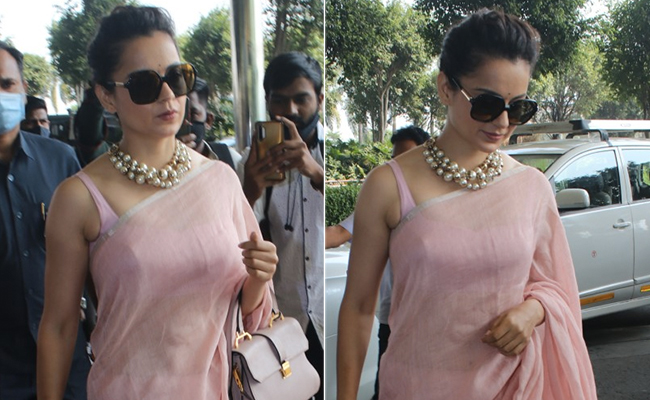 If you've been looking for ways to notch up your airport style then perhaps you should give Kangana Ranaut's style choices a go. Move away from comfy athleisure outfits and loose fit clothes for some desi goodness. Trust Kangana Ranaut to make even heading to the airport a fashion statement. Seen in a spring-summer perfect blush pink saree made of linen, she already aces the season's best styles. She was back in Mumbai for a short trip and is already off for the shoot of her next film, Tejas. Along with her free-flowing saree, she pairs a multi-layered pearl choker necklace and a pastel handbag along with it. She keeps her hair tied up in a messy bun that completely turns the game.