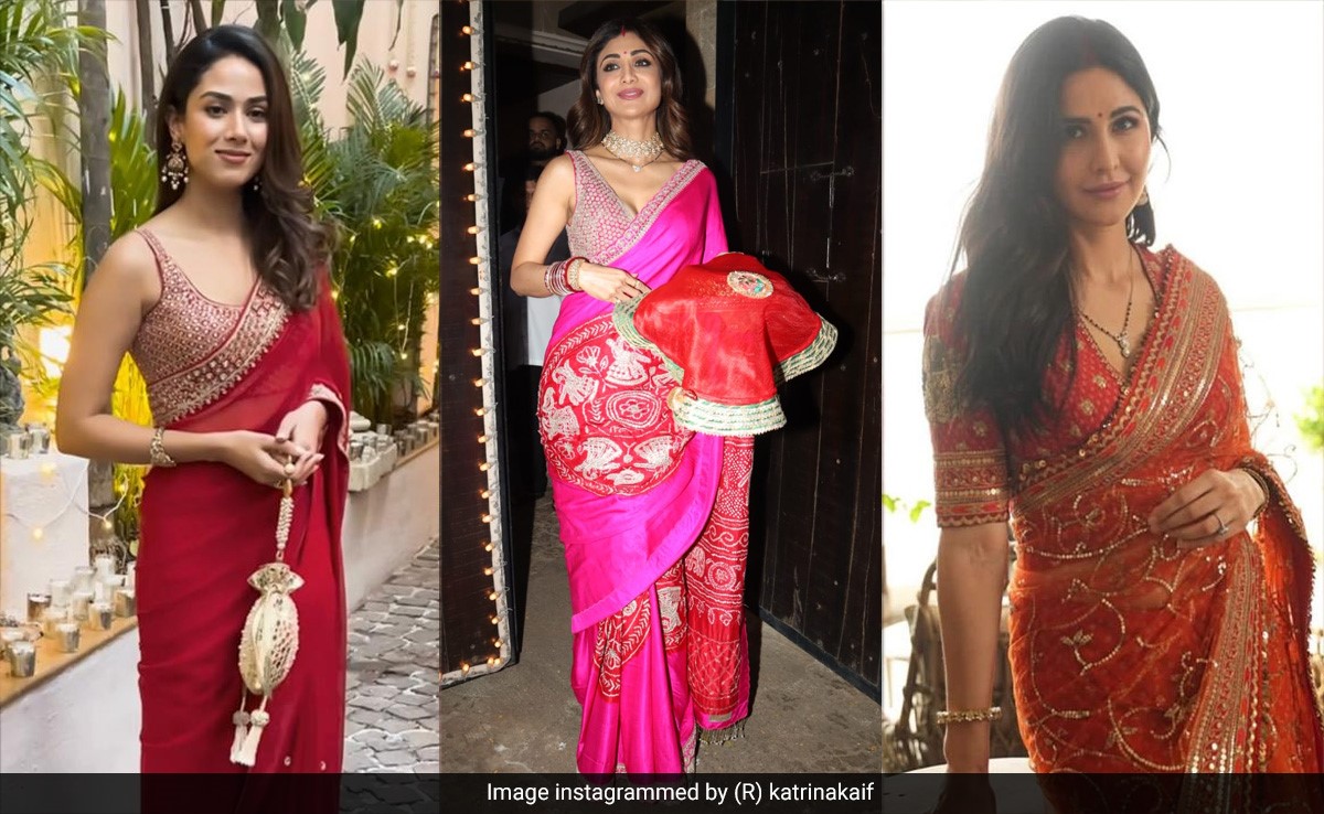 Karwa Chauth is celebrated on a large scale in India where married women indulge in a day-long fast for the health, well-being, and long life of their husbands. The fast is broken at night with the sighting of the moon. Like every year, this year, the festival was elaborately celebrated by Bollywood celebrities and their wives. Katrina Kaif was the epitome of grace and elegance in a red sheer saree with gold zari work throughout. The celebratory saree was by designer Sabyasachi and she looked every bit the minimal fashionista she always is. Katrina teamed it with a short-sleeved blouse that featured zari-work embroidery on the sides. The diva accessorised the look with a delicate mangalsutra, statement ring, and a studded bracelet. She left her hair strands loose, and minimal radiant makeup only to top it off with her matrimonial sindoor.