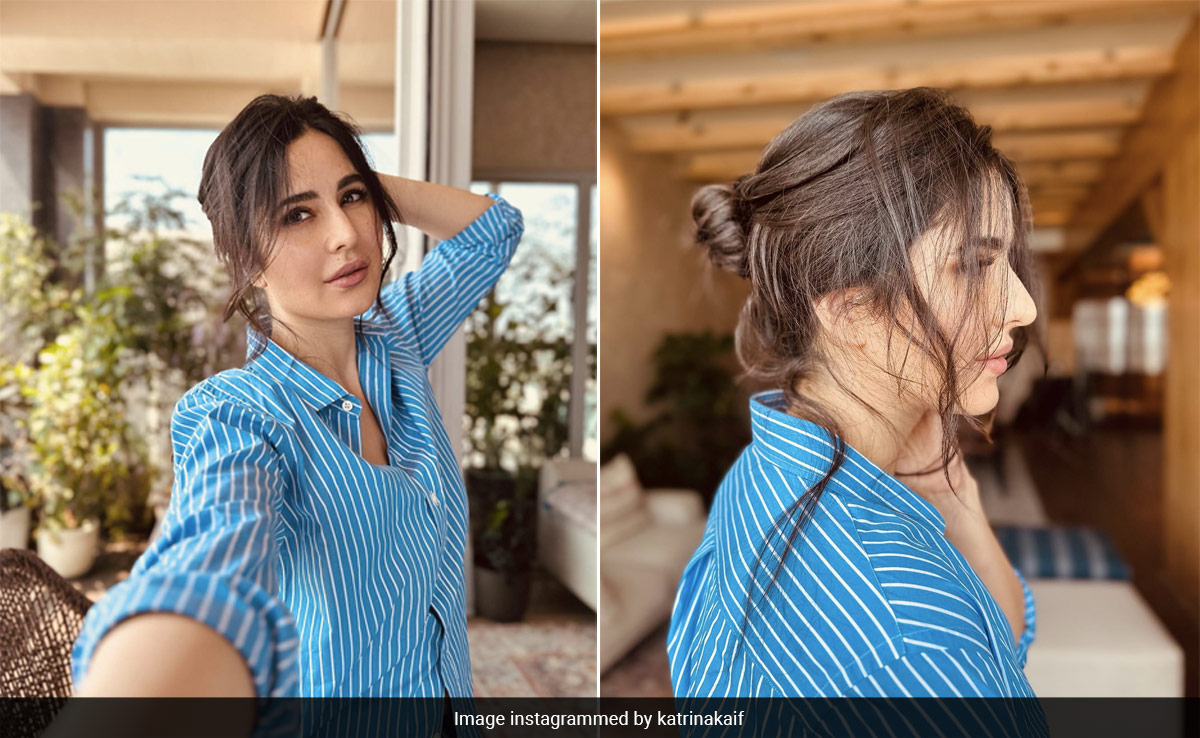 Katrina Kaif's casual diaries are always oh-so-chic. With her effortless style game, the actress always manages to wow us. What's new from her closet? A striped blue shirt and denim pants.The full-sleeve number had rolled up sleeves and white stripes against a blue base. Katrina left the first few buttons of her shirt open. Icy blue denims accompanied her look. Her forever favourite minimal glam with moisturised skin, pink tinted lips, along with soft-kohl eyes was included. But, the highlight for us was her super messy bun, which simply complemented her chic style.