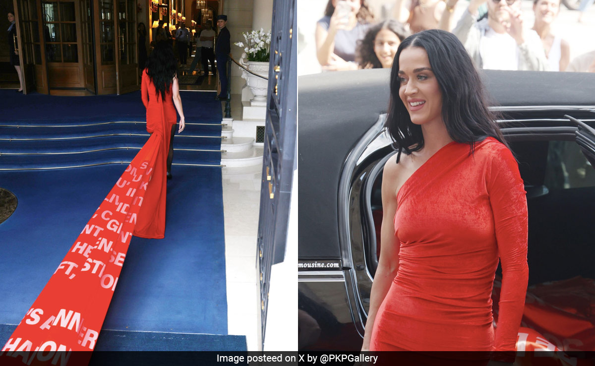 Katy Perry has been making headlines recently for the confluence of her fashion choices with song promotions. The artist announced the release of new music titled Woman's World, which is scheduled for July 2024 and ever since then, has left no stone unturned to turn heads with her promotional looks. The latest one said a lot about it without uttering a single word. How Katy Perry did that was through the language of fashion. In her most recent appearance at Paris Fashion Week, the singer wore a firetruck red mini dress which featured a single covered shoulder which extended into a long sleeve. It had a bodycon fit around her body with a short asymmetrical hemline that ended high on the thigh. Beneath the dress, she wore black sheer tights with pumps. However, it was the train of her dress that grabbed the most attention.