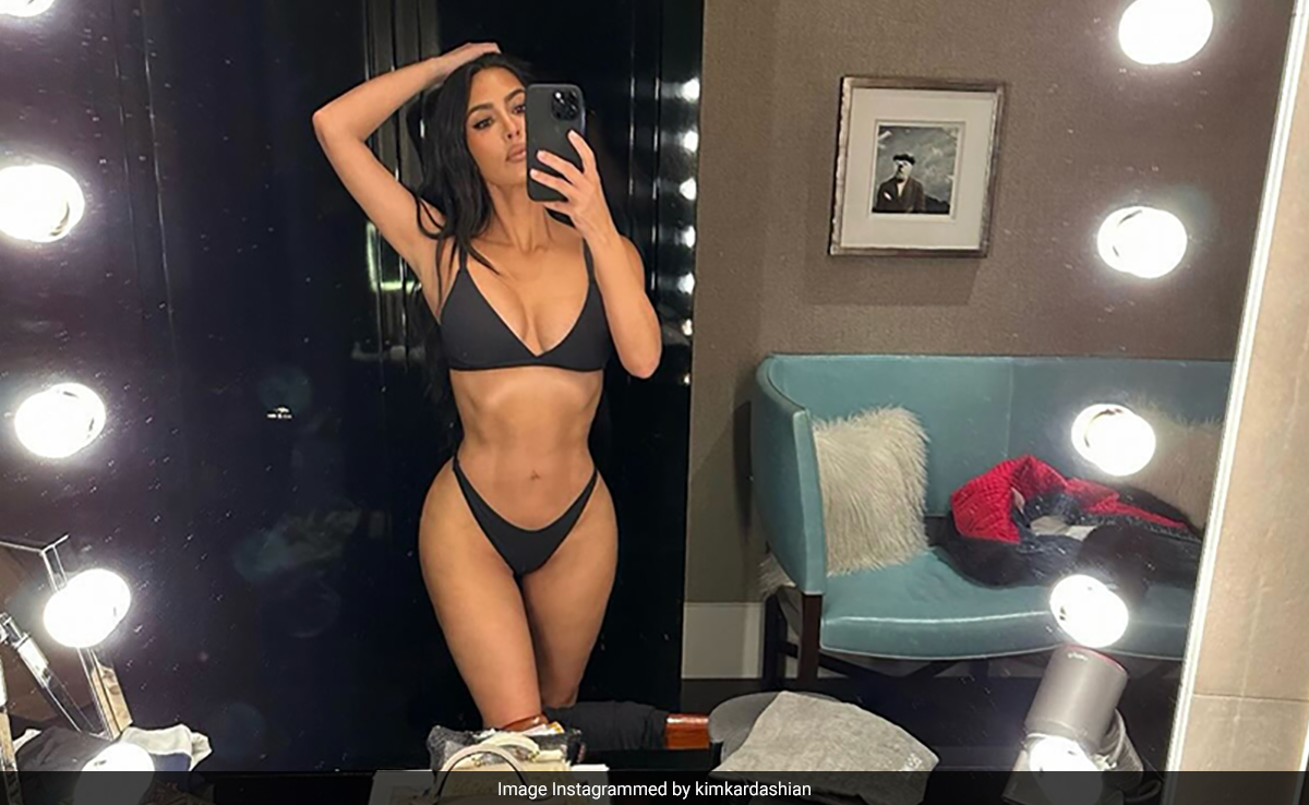 Swimwear is for beach outings and pool poses, but if you are Kim Kardashian then it can be the perfect ensemble for a mirror selfie too. Raising the temperatures in the biting winter, the internet mogul made a splash in an itty bitty bikini set for her latest Instagram click. Kim's beachwear collection always boasts variety and comes in a flush of colours. There's place for blue, pink and a range of chic prints in her wardrobe. But who's to stop her when she takes the classic monochrome route in a black two-piece maillot? Leaving little to the imagination, Kim put on a strappy charcoal black SKIMS bra, featuring a low-cut plunge neckline putting her decolletage on full display. Matching bikini bottoms paved the way for the beauty to flaunt her toned legs, teeny-tiny waist and chiselled abs. Bronzed glam comprising contoured cheeks, nude-brown lip shade, and mascara-coated fluttery lashes with winged eyeliner sealed her sultry beach-ready look. To top off the stunning style statement, Kim captioned the post "IDD8ME." Kim Kardashian is a mood. In this SKIMS bikini, Kim is a self-love, trolls-be-gone mood times 100.