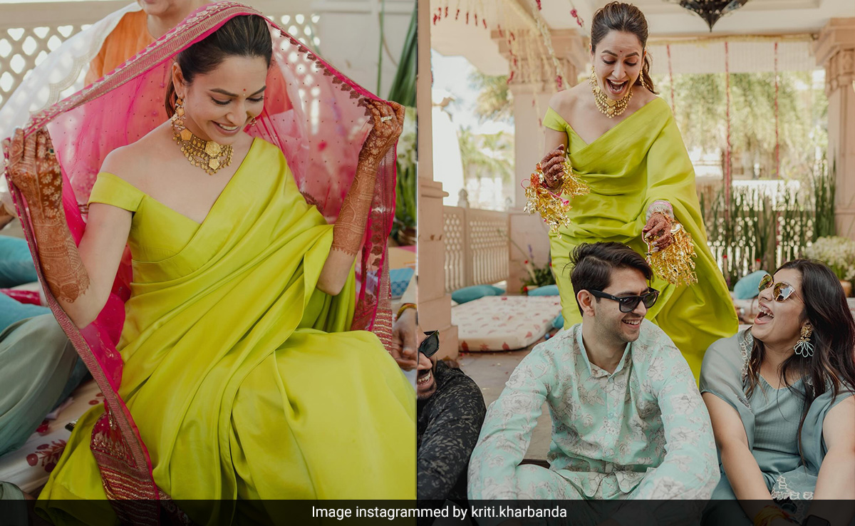 Bridal style is blooming and as we witness 2024 being the year of love, we can't help but take notes. Kriti Khrabanda is the latest celebrity to join the bandwagon as she recently turned into the most gorgeous bride in an Anamika Khanna ensemble. The actress tied the knot with longtime actor beau Pulkit Samrat in an intimate ceremony. After making us go gaga with her bridal style, the actress recently dropped another set of pictures from her chooda ceremony. In a lime green saree, Kriti created monochrome magic with her minimal bridal style. She paired a beautiful, flowy drape with an off-shoulder blouse. While her look exuded sheer sophistication, it was the two elements that notched up her style. The actress added a personal touch to her look as she added her mother's bridal dupatta to the look and it was her nani's necklace that added a traditional essence to her modern bridal style. She posted, "Naani ma ka haar aur ma ki shaadi ka dupatta! The two things I was sure I was going to adorn during my Chooda ceremony even before there was a boyfriend or a proposal." With minimal makeup and her bridal glow, her beauty look was on point.