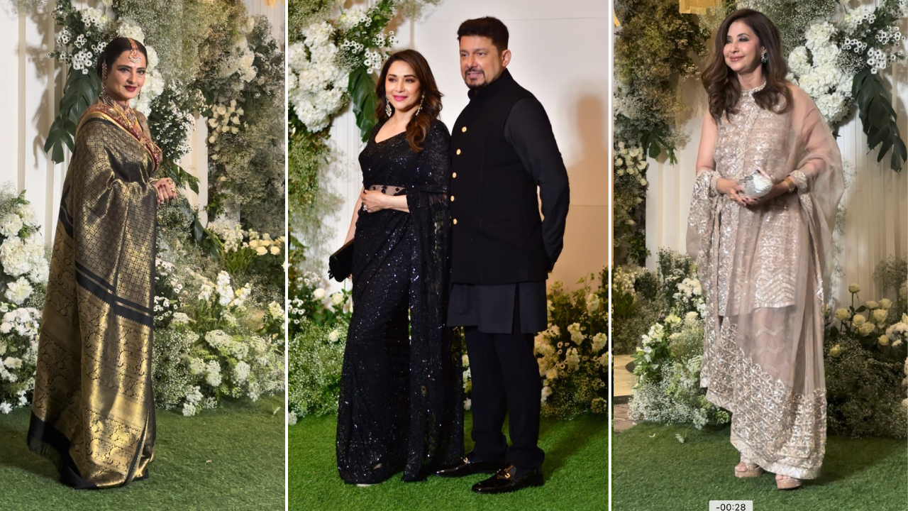 Madhuri Dixit made a grand entrance at the party, accompanied by her husband, Dr. Nene. The dynamic duo set some serious couple fashion goals by opting for chic black ensembles. Dr Nene exuded suave charm in a black kurta, pants, and a sleek sleeveless jacket set. Meanwhile, Madhuri commanded the spotlight in her dazzling saree. She elegantly paired the sequin-studded drape with a half-sleeved blouse that showcased a deep neckline and playful tassel details on the borders of the sleeves. Dangler earrings and subtly curled hair added the perfect finishing touches to her saree avatar.