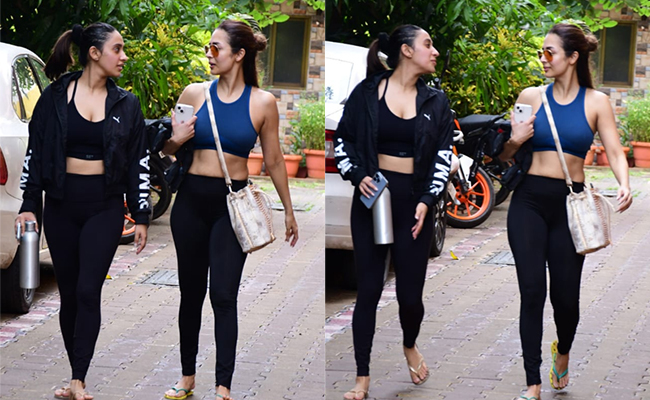 Malaika Arora is a fashionista by all means. She not only wears numerous outfits with ease but also inspires us to add some jaw-dropping ensembles to our closets. Her style repertoire includes everything right from glamorous picks to some attention-grabbing casuals perfect for running errands in the city. However, she is also a pro at nailing athleisure looks. Recently, she was seen wearing a dark blue sports bra teamed with a pair of black pants. To make it more interesting, she teamed it with a pair of yellow and blue slippers. The actress picked a stunning handbag to round off her look. What also grabbed our attention was her hairstyle with some of her tresses tied in a bun and the other half left open. And yes, how can you miss her stunning sunglasses.