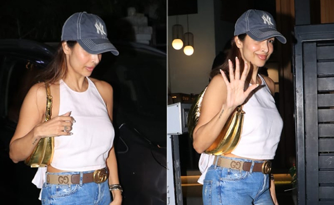 You simply cannot keep Malaika Arora away from the set life for too long. She reportedly met with an accident recently but there's nothing that can keep Malaika missing in action. Well rested and ready to take off once again and she's back with twice as much style to serve. Catching up with family and friends is the usual for Malaika and she did just that recently on a night out with sister Amrita Arora, Kareena and Karisma Kapoor and their families and Malaika caught all our attention. We loved how she upped the fashion scale in a casual chic outfit with her own dressy touch. She picked a white halterneck crop top with a pair of jeans and a brown Gucci belt and topped her look with a denim cap for an easy laidback midweek dinner outing but it isn't Malaika with a touch of gold. She carried a strikingly bright golden hobo handbag and shimmery heels to go with it to make this midweek date night look anything but basic. Her jeans weren't the usual either; they came with a gradient holographic sheen and ripped knees. Casual chic on the outside but hinting for a mood to party, Malaika Arora's dinner date outfit makes it all look seamless.