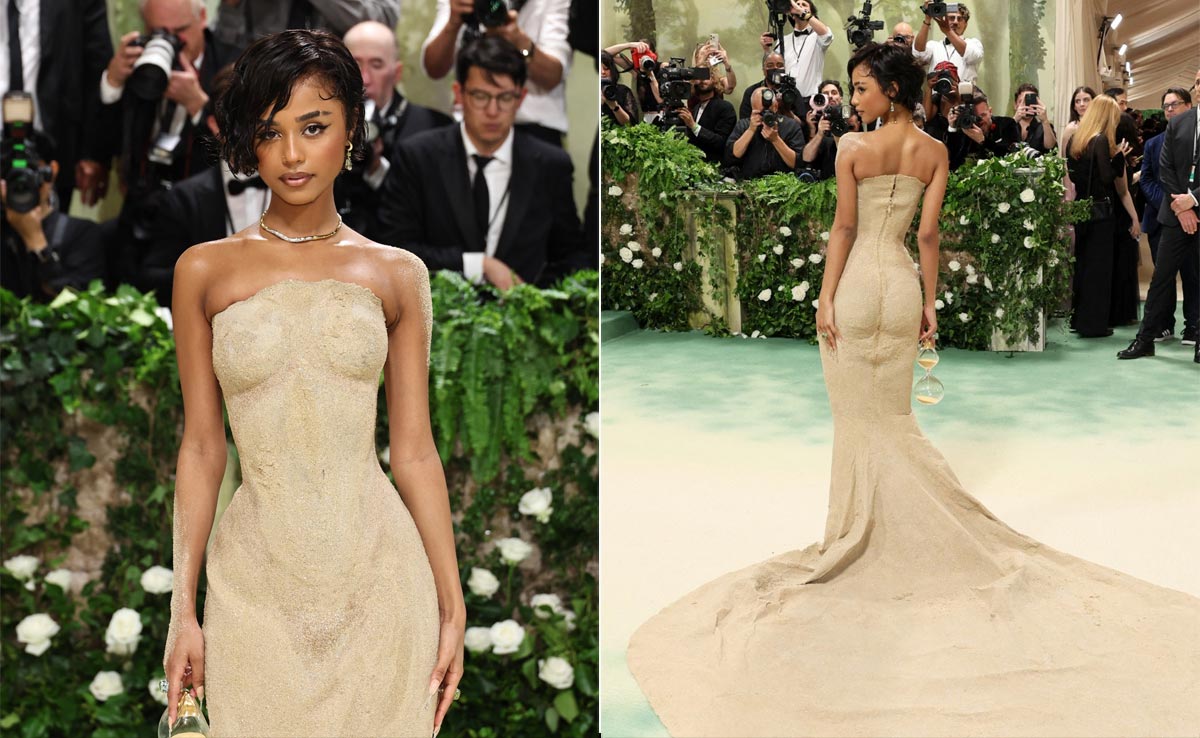 For her Met Gala debut, the Grammy winner was dressed in a Balmain creation that represented the "sands of time". Taking the phrase very literally, Tyla's dress was a strapless beige ensemble with a circular train at the base and a textured sand finish. If it looked as if the contours of the dress at the chest and torso were as if perfectly made for her measurements, that's because they were. As per Hollywood Reporter, Balmain's creative director Olivier Rousteing said, "We molded her body a couple months ago. The idea was she could dress once in the dress and it would be part of the museum," referring to the process of creating the dress that was custom fitted to her body with the sand effect. Completing the theme was Tyla's purse accessory, which was an hour glass that fit the metaphor of the disappearance of time.