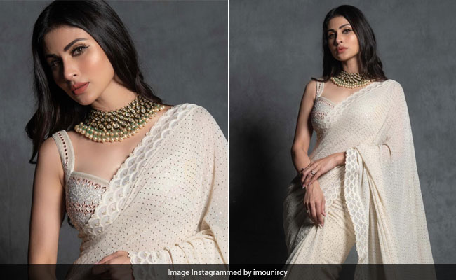 Mouni Roy and her fashion affair with sarees is since forever. The actress never fails to make heads turn with her incredible choices and has always been known to be a "saree girl forever". And yet again, the actress makes a very strong case for the same in a beautiful white saree. The gorgeous saree features self pattern and embroidered borders which are perfectly amping up the style quotient. She paired the look with a sleeveless blouse which featured a sweetheart neckline and slightly colourful detailing which added a pop of colour to the look. Her stone embedded statement necklace perfectly added to the look and was totally a standout piece. She opted for coral toned makeup to complement the overall look.