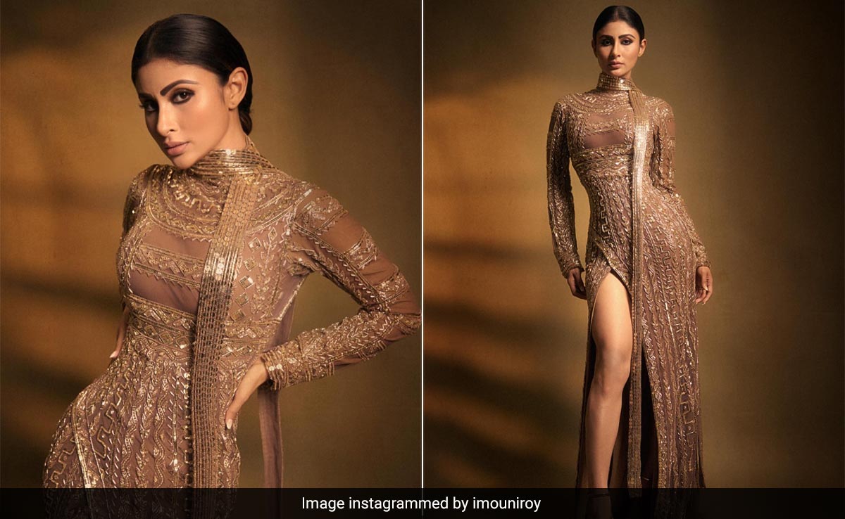 What do we even say about Mouni Roy's fashion choices which have not been said before? Her risque fashion choices have always been applauded by fans and followers. May it be the gorgeous sarees or uber-chic travel fashion, there is never a dull moment when Mouni makes a social appearance. This time, she mesmerised her fans in a bodycon gown embellished in fine beadwork and delicate thread for the GQ men of the year 2023 award function. The full-sleeved ensemble from the clothing label Yas Couture even showcased a daring side slit that accentuated the sass of the outfit. Mouni also carried a thin golden stole with the gown. For accessories, Mouni wore a pair of strappy gold heels. Tying her mane in a sleek manner, the actress opted for her signature makeup with kohl-laden smokey eyes, ample mascara, shimmery eyelids, a well-contoured face, and nude matte lip colour.