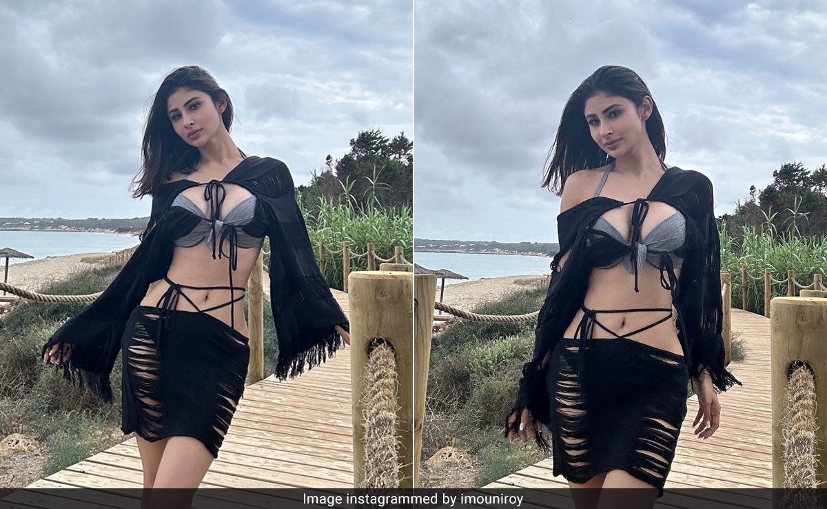 Mouni Roy definitely doesn't need the sun to shine to bring out her best beach style. The Bollywood actress is currently "discovering Formentera", a pristine Spanish island located in the Mediterranean Sea. Unexpectantly enough, she did it while looking her finest even on a grey day while she vacationed. In a recent set of her Instagram photos, Mouni was seen preening on a pier in a delightful beach look. She wore a grey-toned bikini top with matching bikini bottoms. Over it, she wore a black distressed cover-up with flared sleeves which was tied together at the nape. Completing the look was a distressed black skirt with a midriff-flossing detail that accentuated her waist. With the wind in her short dark tresses, the actress posed for the snaps with the beach waves and dark sky in her background.