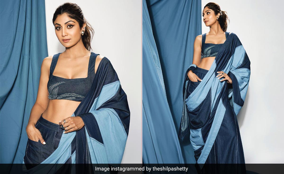 The denim trend is currently reigning supreme in B-town fashion. Over the past few months, numerous divas have been grabbing the limelight with their denim-inspired looks. Timeless beauty Shilpa Shetty recently gave this denim trend a desi twist by wearing a denim saree. Unique, right? Shilpa sported this modern-meets-traditional OOTD during the promotions of her upcoming movie, Sukhee. The stunning ensemble was crafted by Diksha Khanna, who is known for her innovative approach to denim fashion. Shilpa's saree featured a dark-hued skirt, a geometric print with large squares on the pallu, and a midriff-baring blouse. Her hair was elegantly styled in a ponytail. For accessories, she chose silver rings and earrings. Her makeup drew attention with winged eyeliner, well-defined brows, mascara-coated lashes, nude lips, and highlighted cheekbones. To complete her all-denim look, she wore stylish blue heels.