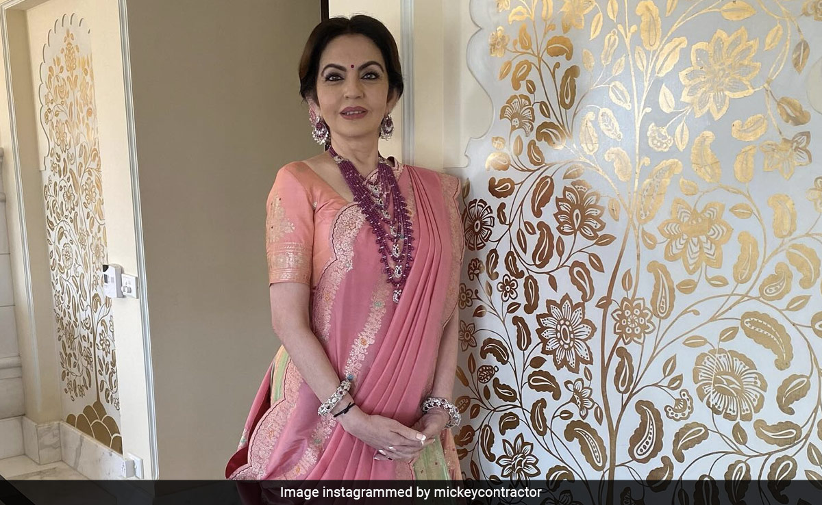 Nita Ambani may be one of the country's most prominent businesswomen but is also an absolute fashion icon. Her majestic sartorial choices and impeccable style have always been our favourite. The style icon has graced the internet yet again in a pastel-toned lehenga saree. As shared by makeup artist Micky Contractor on Instagram, the diva donned a silk saree lehenga. The lehenga set included a peach-coloured short-sleeved blouse with a pastel green lehenga skirt. The kali-patterned lehenga featured dark pink borders with gold zari and gorgeous floral motifs all over. Nita Ambani draped the pink-coloured pallu dupatta traditionally. For accessories, the celebrity picked a layered red-stone necklace with matching earrings and a stack of crystal-encrusted bangles. Her glam makeup including kohl-laden eyes, rosy blush, and pink lip colour completed the look.