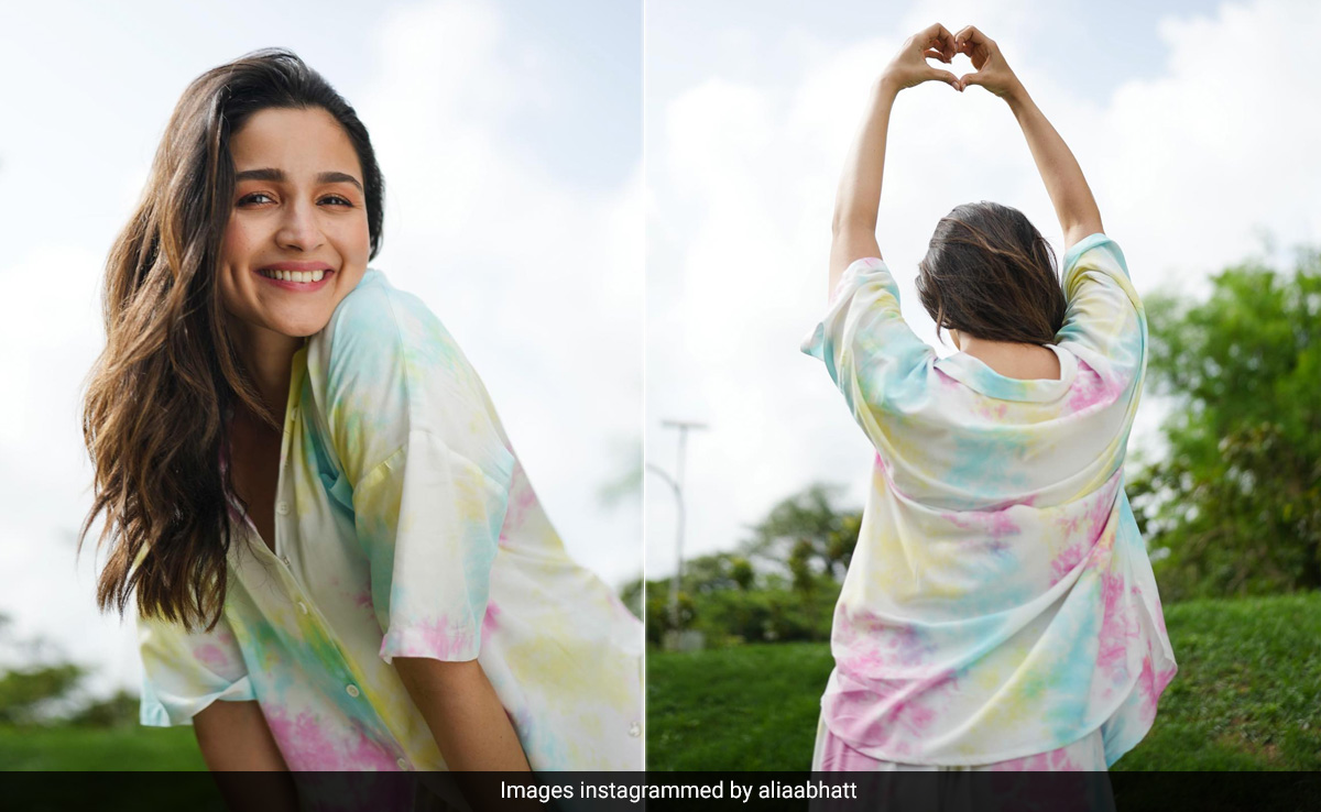 Alia Bhatt's love for colour is not unknown to the fashion world. Be it her sarees in Rocky Aur Rani Kii Prem Kahaani or her cute knit wears, Alia's style statement often carries riots of colours. Our beloved fashionista's latest Instagram entry comes as a solution to everyone's comfort-first wardrobe dilemmas. Alia's treasure trove of fashion inspiration welcomed a breezy co-ord set. The actress wore an oversized tie-dye co-ord set with a white base. The multi-colour ombre work breathes life into the two-piece set. The two-piece set with a collar neckline and button detailing on top and short sleeves is perfect for the season. For beauty, she goes with a no-makeup makeup glam featuring nude pink lips, neutral eyeshadow and blushed cheeks and her side-parted hair open in soft curls