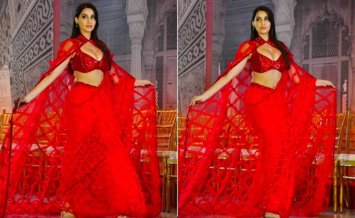 A sparkling red carpet event and a glitzier fashion show ahead marked the festive season forecast with Nora Fatehi in a red saree as the face of it. At the recently inaugurated Jio World Plaza, Indian and international fashion united to create a spectacle for the launch and as the actress and sensational dancer walked down the ramp for Manish Malhotra, all eyes were on her. A sheer red saree with a sequinned blouse in the designer's signature style and a dramatic sheer red cape gave this glimmering event a monochrome touch. The tone-on-tone foliage design running through the saree and cape was festive enough to mark the beginning of the most wonderful time of the year. Soft shades of brown, her sleek and smooth hair took care of the beauty section and just with a drop of green on her ears, it looks like we're ready to razzle and dazzle for the season.