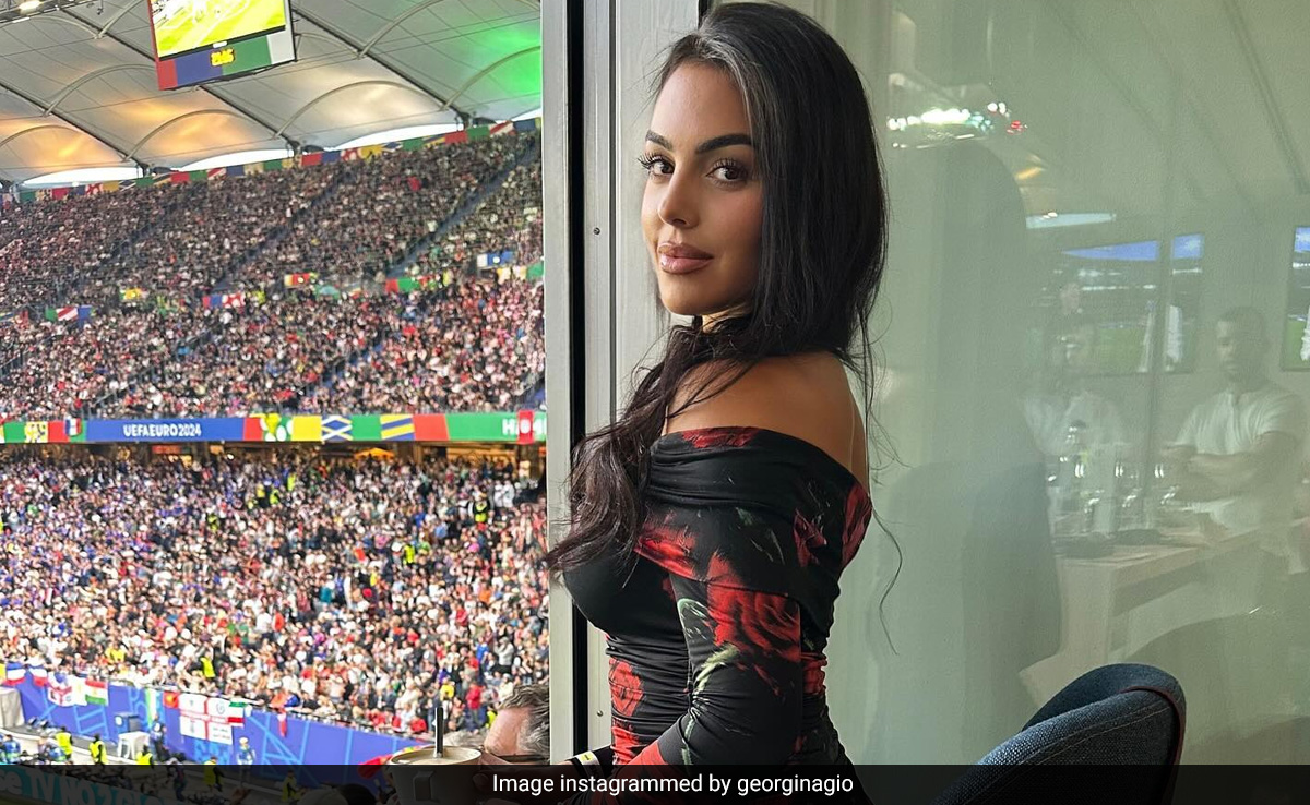 Portuguese football legend Cristiano Ronaldo's partner, Georgina Rodriguez, is a true blue fashionista. On Saturday, she attended the Portugal's match against France in the quarterfinals of the Euros. To support the team, Georgina wore an off-shoulder black mini-dress adorned with multiple red rose prints, resembling the classic red Portuguese jersey. The form-fitting number was from the clothing label Guess. Ruched patterns running all over the ensemble added an extra oomph quotient. Georgina paired the full-sleeved silhouette with knee-high black boots. Her signature glam paired with tinted cheeks was perfect to complete the look.
