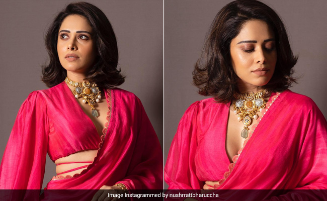 We have often seen Nushratt Bharuccha stealing the limelight with her style statements. Right from show-stealing co-ord sets and sassy dresses to amazing ethnic numbers, she can do it with equal charm. This time around, the actress is back with a saree look and we can't take our eyes off her. Nushrratt wore a fuchsia pink silk saree by Ridhi Mehra. Her beautiful drape featured scalloped borders giving it an extra edge. She matched the peppy number with a statement blouse featuring long balloon sleeves and string details beneath the hem. Besides this, the pink blouse also came with a plunging neckline that lent a modern touch to her traditional look. For accessories, Nushrratt wore a heavy traditional necklace and bangles. For makeup, she chose contoured cheeks, a subtle eyeshadow, mascara-laden eyelashes and a dash of nude lipstick.