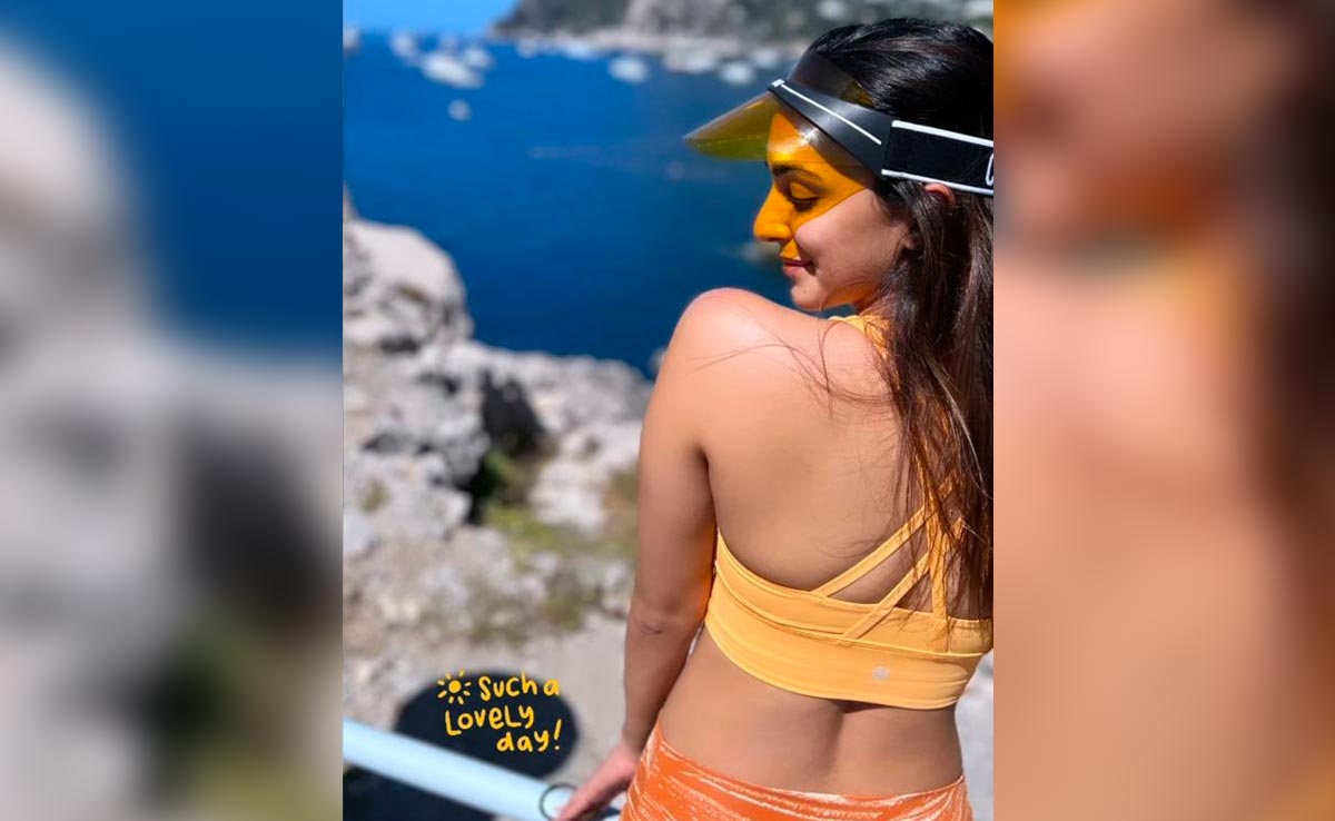 Kiara Advani is currently on a beach vacation with husband Sidharth Malhotra. While we have seen the gorgeous diva in uber chic fashion choices in the past, her recent post grabbed our attention. The actress picked a citrus toned set which included a halter neck bralette which she paired with tangerine printed tights. Not to miss her yellow tinted visor, which kept the sun at bay on the sunny morning. Her backdrop included blue waters and we cannot admire the picture-perfect travel style enough.