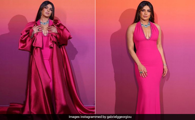 We have seen bright pinks rule the fashion scene in 2022. Right from Valentino's PP Pink on the runway, to the coming of barbiecore, to rani pink fashion sensibilities for the festivities back home, we should have only seen this coming. The Pantone Colour Of The Year 2023 is Viva Magenta. A snazzy fuchsia tone with bright red undertones, the magnificent colour is inclusive and unapologetic, electrifying and borderless and powerful and empowering, all that represents the cultural pulse of our times. Coincidental or not, it's not a surprise that it reached Priyanka Chopra just in time for her appearance at Bulgari's new collection unveiling in Dubai. A bright pink halter gown came with an embellished plunging neckline and the silhouette that seemed like second skin on her. But the drama don't stop there, friends. She adds a statement taffeta trench coat with large ruffled shoulders and it can't be a Bulgari show without their stunning jewels on her. She wears a neckpiece with matching earrings from the new collection that further lends a colourblock touch. Beautiful with or without it and we'll accept no other exceptions.