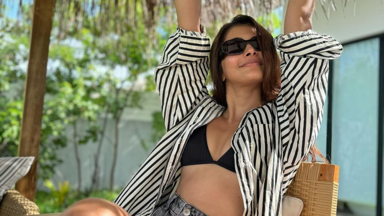 Pooja Hegde is undoubtedly a true style icon. The actress effortlessly transitions from sarees to gowns, monokinis to lehengas, and manages to look equally captivating in every ensemble. With every public appearance, she consistently commands attention and drops jaws. But when it comes to her vacation looks, she's in a league of her own, presenting dreamy outfits that any fashionista would envy. Lately, during her Maldives getaway, Pooja has been taking her vacation style up a notch by incorporating shirts in a laid-back, effortlessly chic manner. In her latest Instagram post, she gave us a glimpse of her holiday look, and it's nothing short of fabulous. Pooja wore a black plunging neck bralette, flawlessly paired with grey high-rise denim shorts. However, what truly elevated the coolness quotient of her look was the addition of a shirt. Her white shirt featured stylish black horizontal prints. Her casually rolled-up sleeves and unbuttoned look were perfect to give off that relaxed and effortlessly cool vibe. To complete her holiday look, Pooja opted for black sunglasses, let her hair flow freely, and embraced a makeup-free, natural beauty look.