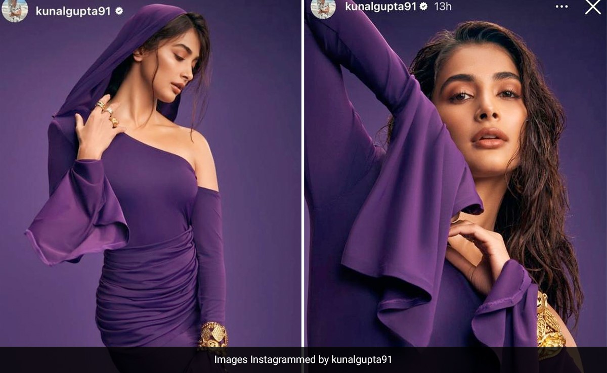Ever since she made her Bollywood debut, Pooja Hegde has been winning hearts for her stunning fashion and phenomenal performances. May it be her red carpet gowns which were exquisite or her festive fashion which has made us want a wardrobe revamp, Pooja's sartorial choices have always been head-turners. On the cover for Filmfare, she continues to do so. The actress donned a gorgeous one-shouldered gown in a rich purple shade. The body-hugging outfit featured full belle sleeves with a close neckline and hooded pattern. The cinched waistline and the fitted bottom looked elegant and poised on Pooja. Her glammed-up dewy makeup included kohl-laden eyes, pink eyelids, well-contoured cheeks, and glossy nude lip colour. For accessories, she opted for a golden kada and several statement rings. Pooja's wet-hair glam look matched the majestic vibes of the gown perfectly.