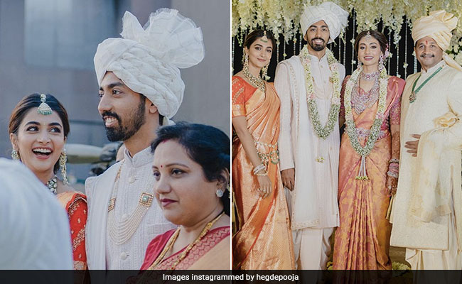 Pooja Hegde is on cloud 9. Reason, you ask? Her brother Rishabh Hegde got married “to the love of his life” over the weekend. The actress, who was away from social media, is back with some breathtaking pictures of her brother's wedding ceremony. Rishabh Hegde, who is an orthopaedic surgeon, opted for a white sherwani for the big day. But, our eyes were glued to Pooja's orange kanjivaram saree. The actress teamed the drape with an embroidered half-sleeve blouse, which was laced with golden embellishments. Heavy statement jewellery with green stones and pearl detailing added more gravitas to her traditional wear. She pulled back her tresses in a long braid sleek and adorned it with gajra. Pooja's glowy skin was complemented with highlighted cheeks, blush pink eyelids, kohl-rimmed eyes, and coral lips. The pictures from the wedding ceremony scream only love.