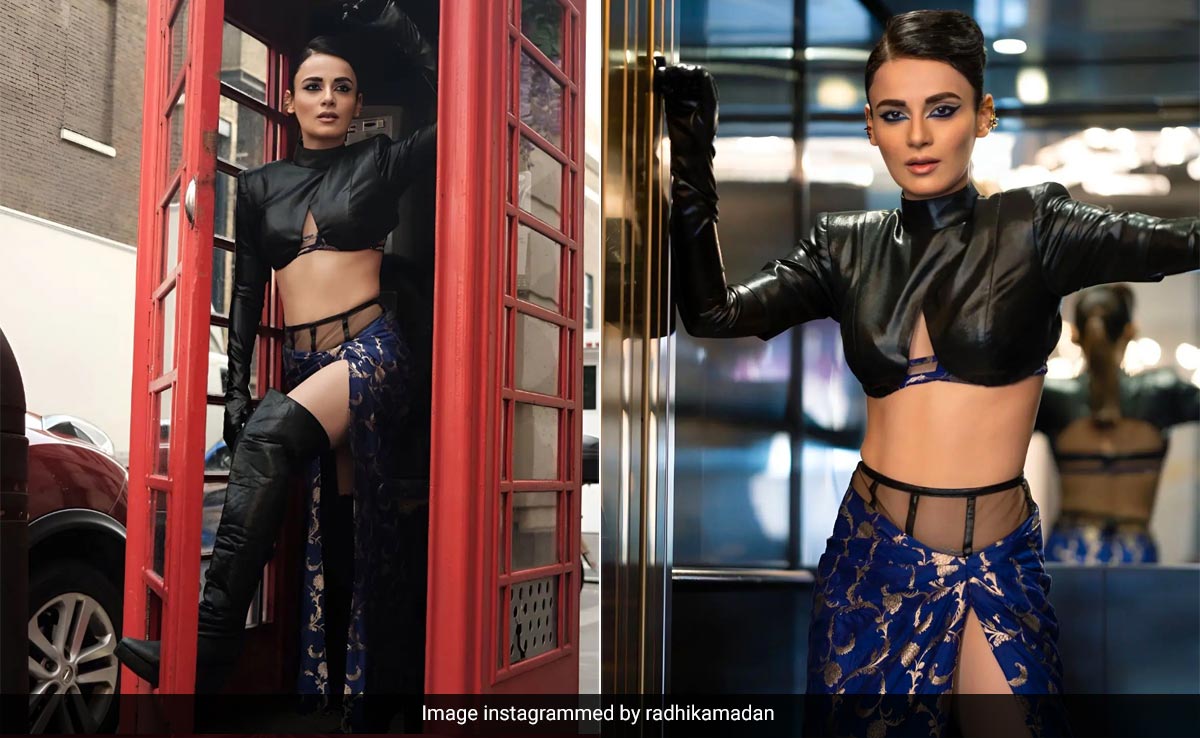 - Radhika Madan pairs a black leather bustier with a royal blue skirt