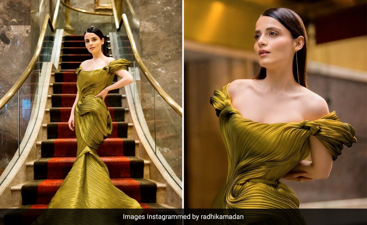Radhika Madan's phenomenal performances in Bollywood right from her debut have won many hearts in the past. Her wardrobe choices followed suit almost instantly. Her latest movie Sanaa heads to the New York Indian Film Festival. For the prestigious occasion, the actress picked a metallic gown in olive green for its premiere night. The off-shouldered floor-sweeping gown is made with a structured wavy silhouette that drapes her physique perfectly from every corner. The outfit was from the clothing label Nour by Neharika. Radhika. She left her tresses in a sleek style with a side partition and opted for minimal makeup with shimmery eyelids, kohled eyes, and nude lip colour.
