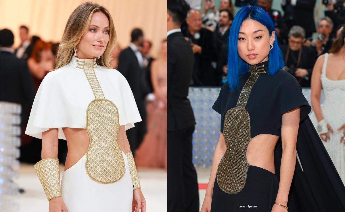 That brings me to the 2023 Met Gala version of the very fashionable optical illusion. Hollywood actress Olivia Wilde attended the event wearing a vintage Chloe gown with a column silhouette. The white dress featured short cape sleeves with an embroidered gold violin panel, cutouts over the torso and matching gold cuffs. Olivia wore the high neck number with her blonde locks in waves, subtle gold makeup and diamond danglers.