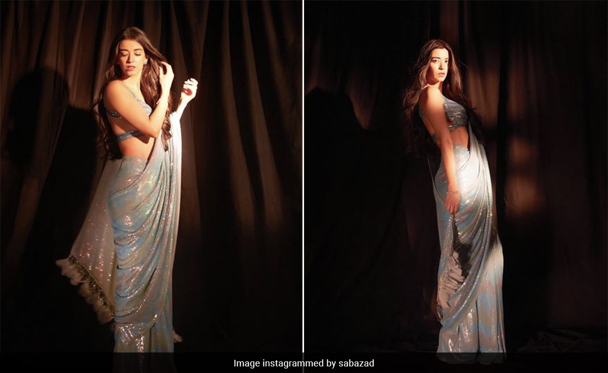 Saba Azad can make any outfit appear stylish. From subtle casual numbers to high-shine sequined ensembles, the rockstar's wardrobe is flooded with a variety of uber-cool outfits. Now, she has come up with a chic ethnic look in our forever favourite - saree. Yes, Saba, in her latest pictures, is draped in a gorgeous sequined saree from the house of ace fashion designer Manish Malhotra. The sparkling saree featured delicate blue and silver sequins all over. What added more pizzazz to her saree was the dramatic feather detailing on the hem of her pallu. Saba wore it with a sparkling strappy blouse showcasing cutouts at the back. For accessories, she wore studs, a ring, and a delicate bracelet. To match the drama, Saba opted for dewy makeup, winged eyeliner, and tinted lips. Her silky hair was left open.
