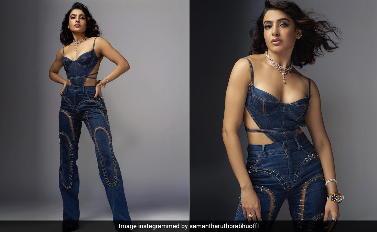 Every time we want to transform into rock chic, we snoop around Samantha Ruth Prabhu's social media page. Whether on a vacation or duty calls, the actress never fails to leave behind a trail of inspiration with her stylish picks. Samantha recently appeared on MTV Hustle and her OOTD was trendy to say in the least. For her guest appearance on the reality show, Samantha gave a whirl to the denim-on-denim trend. The actress picked a corset-style top which she teamed with ripped baggy jeans, by the clothing label ACT N°1. The crop top featured a plunging neckline that was held together by its slinky noodle strings. The risque number carried a backless detailing, adorned with noodle strings in criss-cross tie-up style. The ribbed part of the jeans was held together through numerous safety pins, adding an extra edge to her look. Following the path of more is less, Samantha completed her look with a multi-layered chain-style necklace and cuff bracelets. With shimmery eyes nude pink lips and a matte base, Samantha glammed herself to perfection. She left her side-parted curled hair loosened.