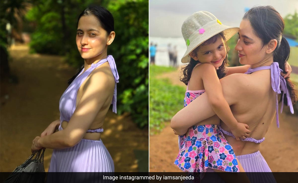 Sanjeeda Shaikh's latest screen outing was in Netflix's Heeramandi however, she is also a single mama raising a baby girl named Ayra. What's more, the yummy mummy of one is posing away with her little one on a beach getaway. Sanjeeda posted adorable pictures on her Instagram handle dressed in a dreamy lavender accordion-style dress holding onto her munchkin in a floral skirt and top co-ord set. It truly made for a mushy mama's girl moment on the internet. Sanjeeda Shaikh sported a lavender cutout maxi dress that was the perfect pick for a beach day. The upper bodice of the dress featured a bralette-front with plunging neckline that graduated into a halter neckline with a tie-up closure. A crinkled strap ran across her back, that secured the dress on her torso. This followed by a cutout detail around the waistline and beautifully led into a maxi-length pleated A-line skirt. She added the perfect accessory to the look with her grey fringe Stella McCartney handbag. Finally, the actress tied the look together with a dewy no-makeup look with nothing but a berry toned glossy tint on her lips and her straight black tresses worn in a long ponytail.