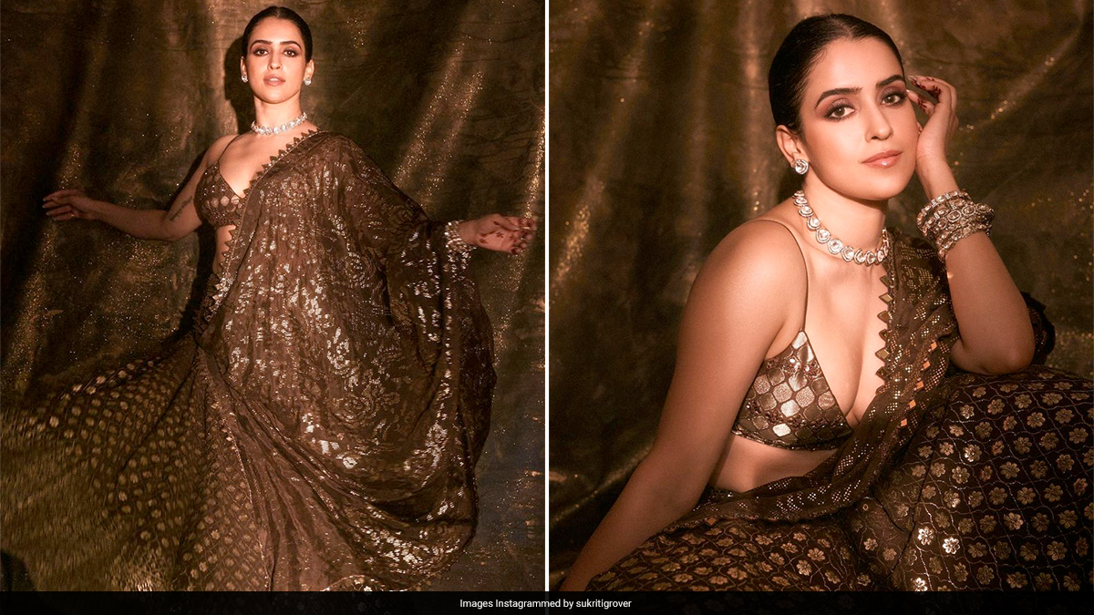 We often spot Bollywood celebrities in their ethnic finery and we can never get bored of that as some looks leave a mark in our minds. Making a strong case for beautiful traditional attire is actress Sanya Malhotra in a beautiful bronze lehenga from Sawan Gandhi. We love how she paired a beautiful plunging neckline strap blouse with a heavy-duty flared lehenga skirt. Her gorgeous dupatta added much-needed flair to the overall style. She kept it minimal with a super sleek necklace, bangles and studs. Her neat bun and copper makeup was perfect to top it all.
