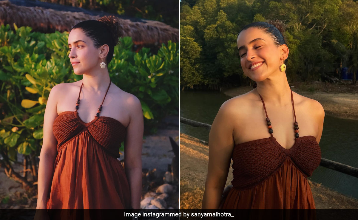 Sanya Malhotra had the time of her life during her recent Thailand vacation and her Instagram timeline stands as proof. She was kind enough to share glimpses of her beach getaway on the platform, with a sprinkle of her tropical fashion. In her latest social media entry, the Jawan actress slipped into a halter neck mini dress. She channeled her inner Moana in the flowy fit, featuring halter neck straps and a knitted bustier. The delicate monotone beadwork on the straps added a coastal edge to the fit. Cascading down in pleats, the breezy ensemble aligned with Sanya's mood for relaxation. White shell earrings and a watch were her sole accessories for the day out. For makeup, the diva allowed her natural radiance with rosy cheeks and glossy pink lips offering the finishing touches.