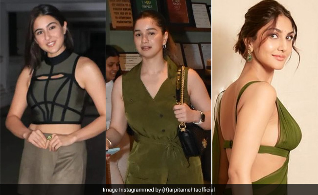 While we are still wearing bright colour pop outfits of summer 2022, the Bollywood celebrities are adding new hues to our colour palettes. The latest addition is olive green which has made it to the monsoon palette of the season. The shade of green is loved by many of the celebrities as we see them adorning outfits in olive green at various occasions in and around the city. From Sara Ali Khan to Vaani Kapoor, we have seen some swoon-worthy olive-green outfits and we are literally drooling over their looks. Sara was snapped by the photographers at a party in an olive crop top featuring a high neckline and cutout at the neck. Sara paired it with a lighter toned wraparound skirt and looked ultra stylish. The diva adorned the look with nude makeup and strappy heels.
