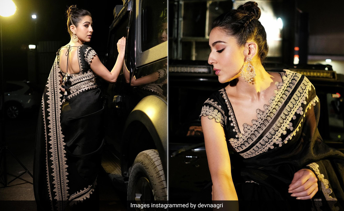 Sara Ali Khan and her sarees redefine elegance. Be it on vacation or simply on the red carpet, Sara transforms into a timeless beauty every time she drapes a six-yard. Proving us right again, Sara wore a black embroidered organza saree by Devnaagri which, as per the official brand website, is priced at Rs 57,000. The actress looked ethereal in the georgette drape adorned with contrasting gold dori embroidery on the borders, which also highlighted elegant cutwork. Sara teamed the saree with a matching raw silk blouse having sequin work and ornate dori embroidery on its neckline and cutwork short sleeves. A sleek braided high bun was a perfect match to her traditional look. She rounded it all with dewy glam that included glossy pink lips, eyeliner and perfectly arched brows. A gleaming pair of gold statement earrings were a nice addition to her look.