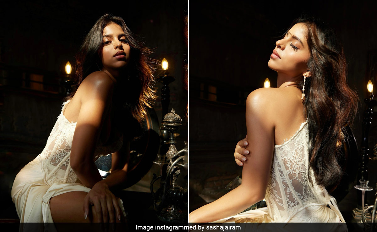 Suhana Khan has recently set fire to the internet yet again. Ace celebrity photographer Sasha Jairam shared images of her wearing a delicate lace and silk outfit for a photoshoot. The Archies actress looked like a glowing goddess with golden light falling on her face and body while she posed for the cameras.