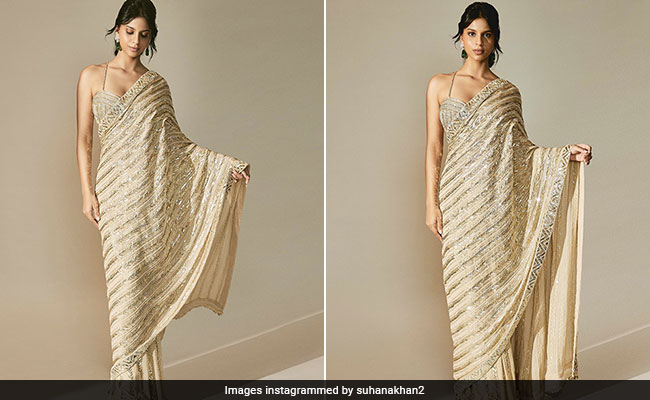 - Suhana wore a gold Manish Malhotra saree to attend a Diwali party