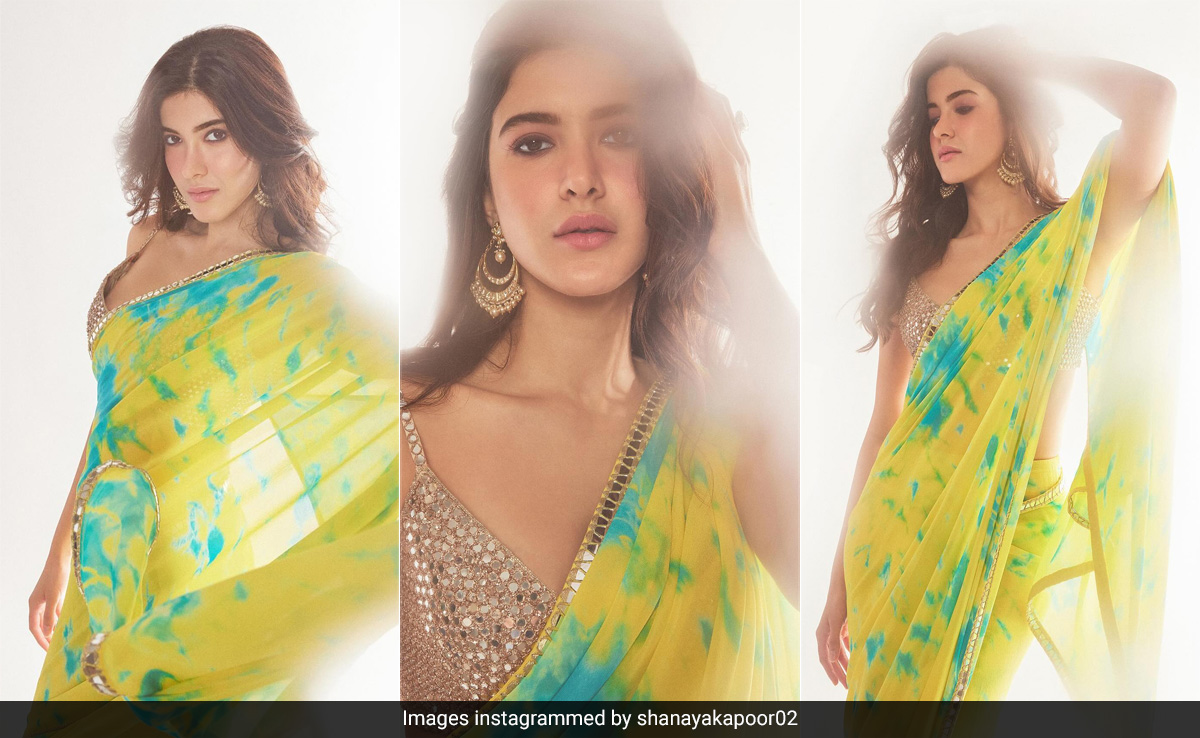 Shanaya Kapoor has been hit by a wave of desi energy. From princess lehengas to gorgeous sarees — her ethnic wardrobe is a dream come true for fashionistas. Inspired by Alia Bhatt's Rocky Aur Rani Kii Prem Kahaani character Rani Chatterjee, the star kid draped herself in a chiffon saree from the shelves of fashion label Akanksha Gajria. Perfect for a mehendi ceremony this wedding season, the six-yard drape comes with a mellow yellow hue with blue tie-dye blotches all over. Skinny golden borders added a subtle glam factor. Shanaya teamed up her pretty pastel drape with a sleeveless golden blouse featuring exquisite mirror work, spaghetti straps, and a plunging neckline. Traditional jhumkas enhanced her allure. For makeup, the beautiful lady opted for a dewy finish with rosy cheeks, nude lip colour, a deadly eyeliner-kohl combo, and fluttery lashes. She left her hair open sealing her elegant OOTD.