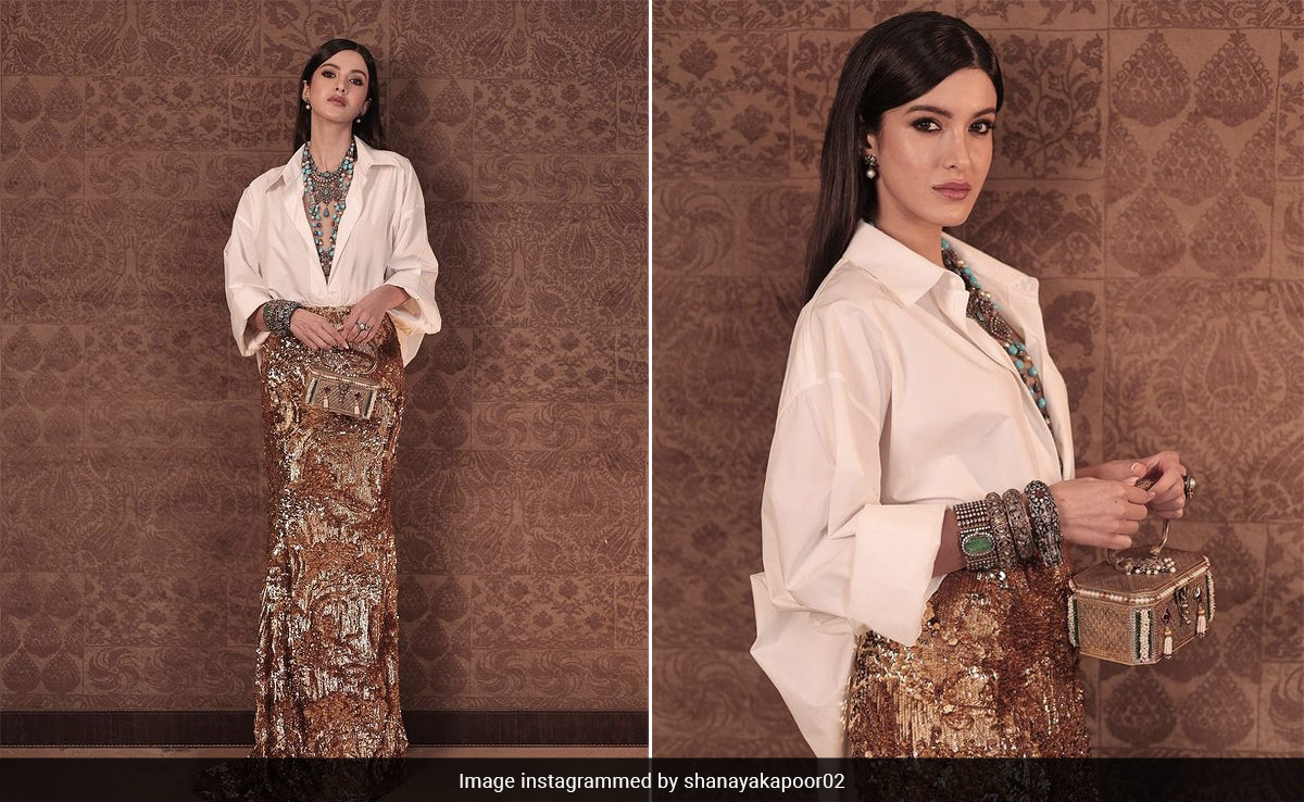 Shanaya Kapoor may be yet to make her Bollywood debut but the aspiring actress is already a hit with fashion lovers. Shanaya recently turned up at an event in Mumbai looking gorgeous. On the occasion, the fashionista chose to step out in a creation by the Italian luxury fashion house Maison Valentino. She paired her oversized white shirt with a golden skirt that hugged her toned physique. Along with it, she chose to go the maximalist way when it came to accessories. She went with layers of necklaces in gold and coloured stones. To this, Shanaya Kapoor added a stack of bracelets and a lovely bag. All her accessories were from Amrapali Jewels. Her makeup was simple with defined eyes and glossy lips.
